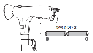 ②【電池の向き】手前に乾電池の「+ブラス」が来るように単4電池を2本入れてください。