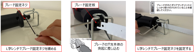 ※ブレードが のこぎりアタッチメント にしっかり取り付けられていることを確認してください。