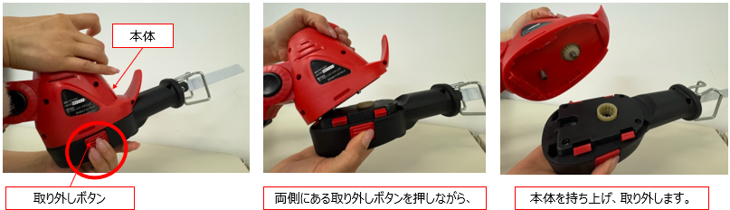 のこぎりアタッチメントの両側にある 取り外しボタン を押しながら、取り外します。