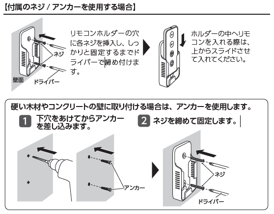 リモコンホルダーを壁に取り付けてご使用する際は、付属の「両面テープ」または「ネジ/アンカー」を使用して取り付けることができます。