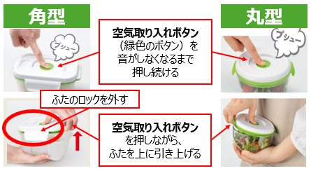 ●丸型コンテナ:緑のボタンを押しながら、ふたを上に引き上げてください。