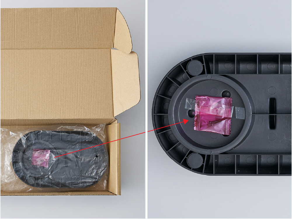 ネジは、とても小さな透明のビニール袋に入っており、充電スタンド(下)の裏面にテープで貼り付けられています。