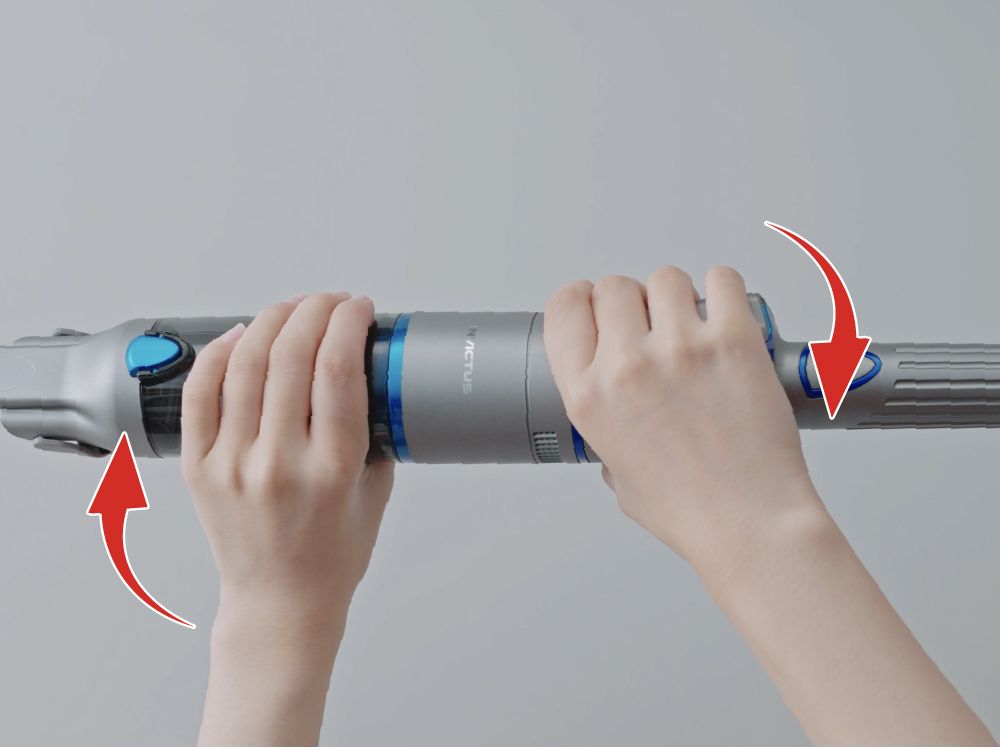 ロック解除ボタンをハンドル側にスライドさせながら、ダストカップを回して取り外します。
