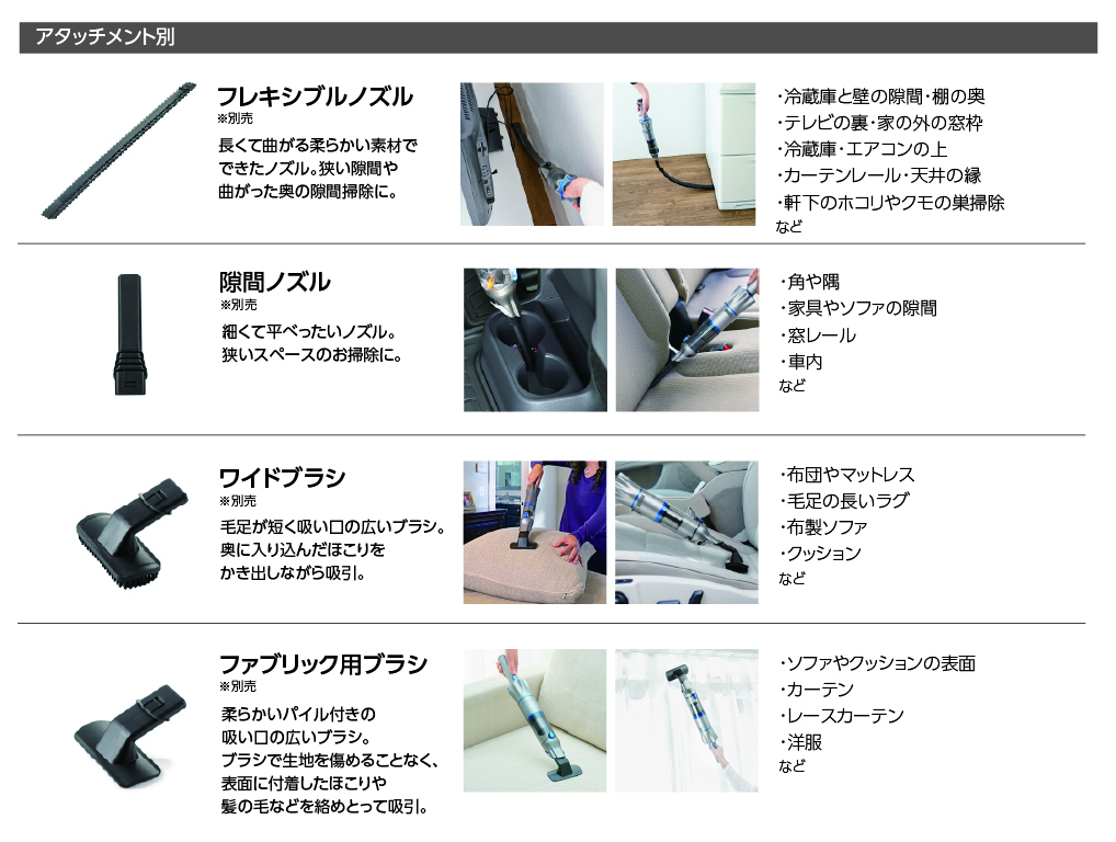 ※各アタッチメントの使い方については、「使用方法について」の質問ページにそれぞれ記載しております。