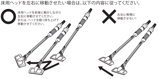 左右に無理に動かすと、床用ヘッド部分に無理な力がかかり、本体のダストカップが外れる原因となります。