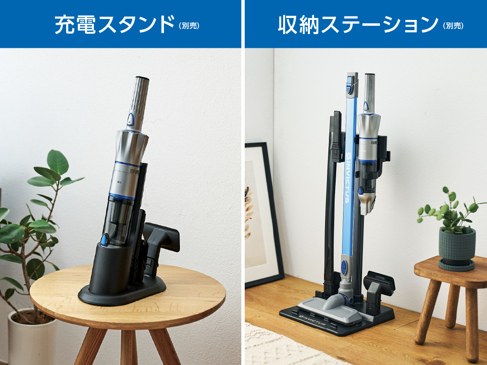 収納ステーションは自立式で、置くだけで充電が完了。アタッチメントもまとめて収納でき、好きな場所に移動可能です。