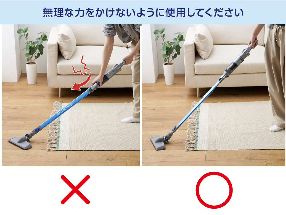 ●柄の長いアタッチメント(延長パイプ・フレキシブルノズル)を使用時に、ゴミ捨てボタンに負荷がかかった
