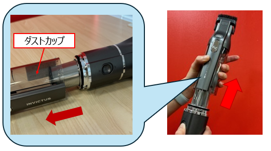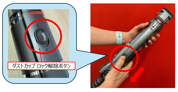 ①ダストカップのロック解除ボタンを、ハンドル側にスライドさせます。