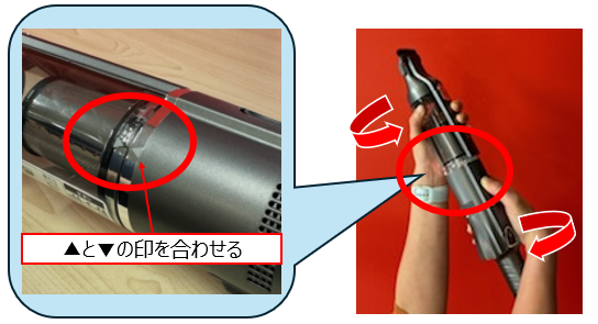 ②ダストカップを ▼と▲のマーク が合うように、カチッと音がするまで回します。