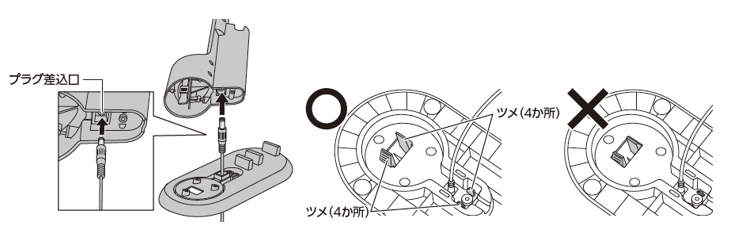 ①充電アダプターの充電プラグを充電スタンド下部の裏側から穴に通し、充電スタンド上部のプラグ差込口に接続します。
