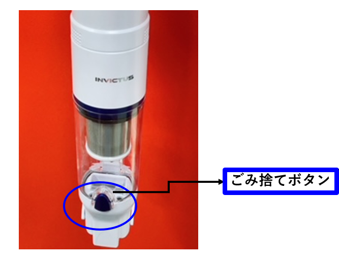 ※ゴミ捨てボタン部分に負荷がかからないように、ゴミ捨てボタンの裏側あたりに手をそえないでください。