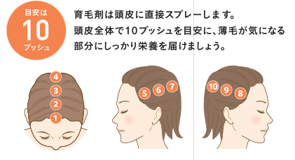 ※気になる薄毛部分がある場合は、この10プッシュに加えて+3プッシュが目安です。
