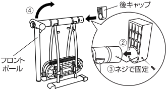 センターポールのネジ穴と、前キャップのネジ穴を合わせてください。