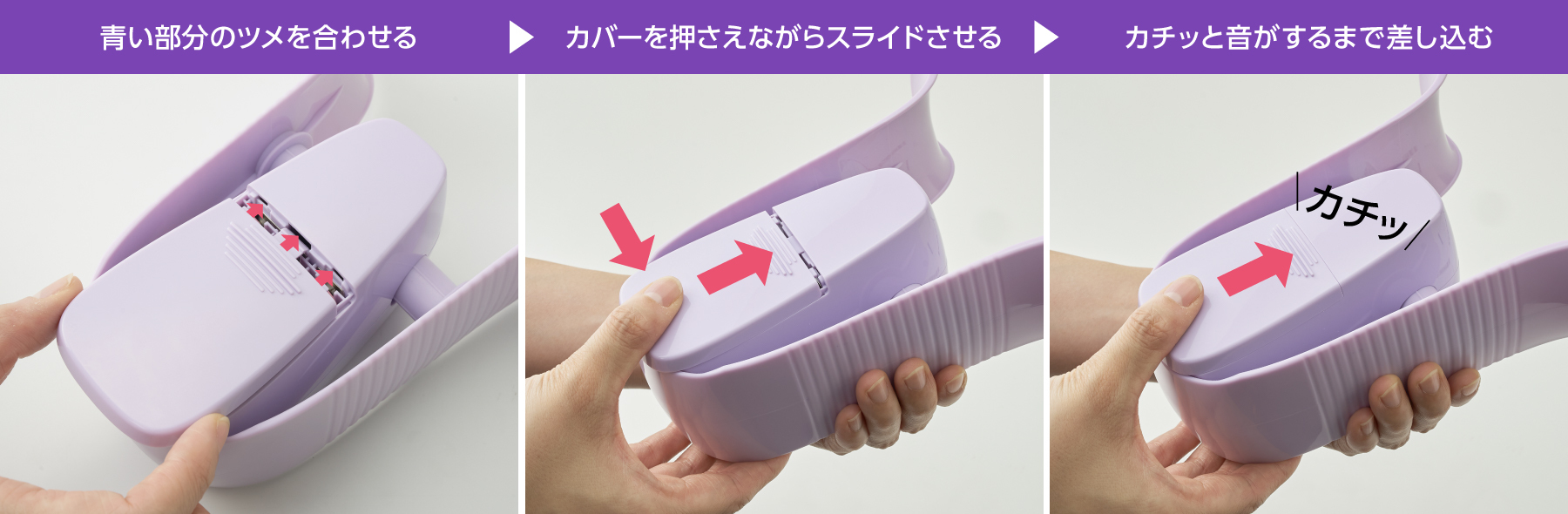 ③カバーを押さえたまま、ツメに向かってスライドさせます。
