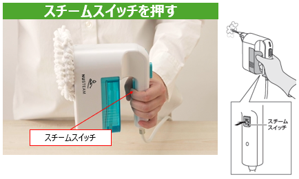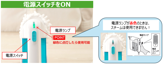 ⑤電源ランプが緑色に変わったら、スチームスイッチを押してスチームを出しながらお掃除します。