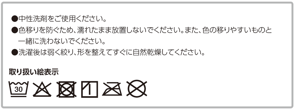 ・洗濯後は弱く絞り、形を整えてすぐに自然乾燥してください。