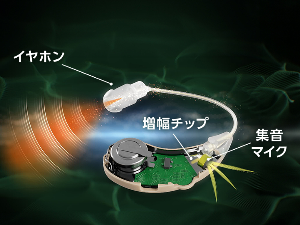 取り込んだ音を、本体内部の増幅チップで大きく・聞き取りやすい音に加工します。