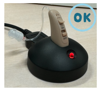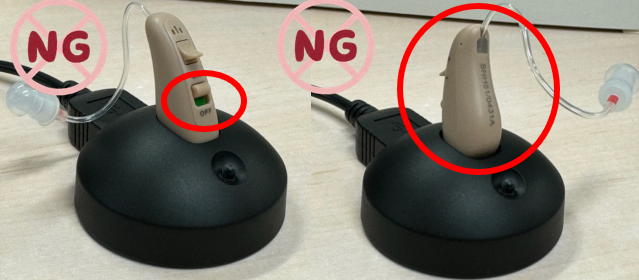 ❷補聴器を充電台に真っ直ぐさし込みます。