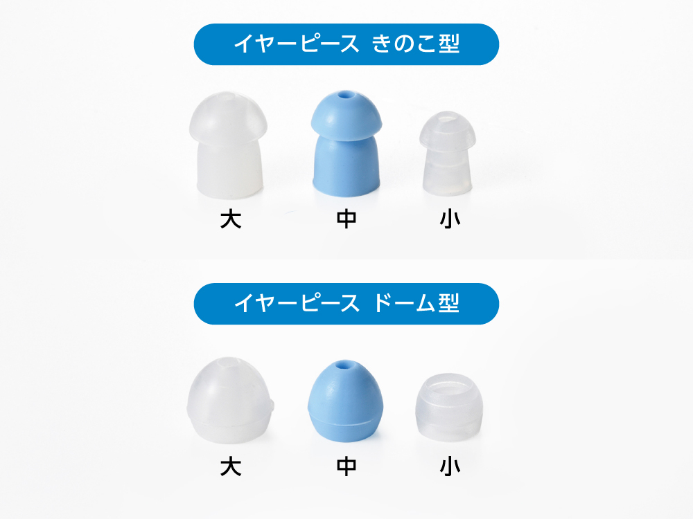 イヤーピースは、きのこ型(中・大 各1)、 ドーム型(小・中・大 各1)があります。