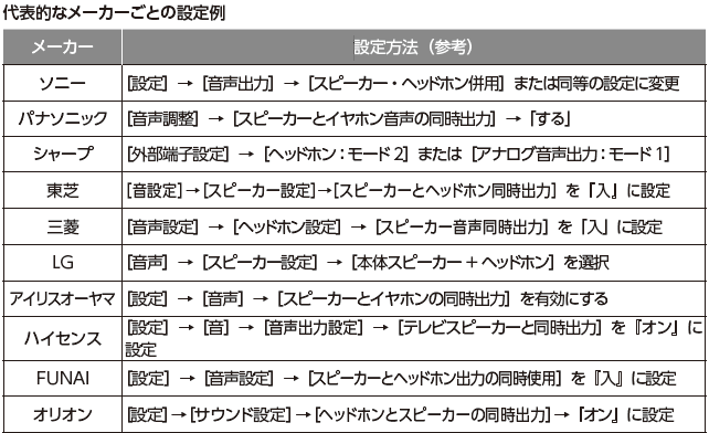 下記表に記載のないメーカーや設定方法が異なる場合は、ご使用のテレビの取扱説明書や各メーカーのサポートページ、お使いのテレビメーカーにて「ヘッドホンとテレビスピーカーを同時に使用する方法」についてお問合せください。