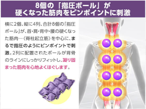 ボタンで連結できるメインパーツを使い、寝転ぶだけで首・肩・背中・腰などのコリにアプローチできます。