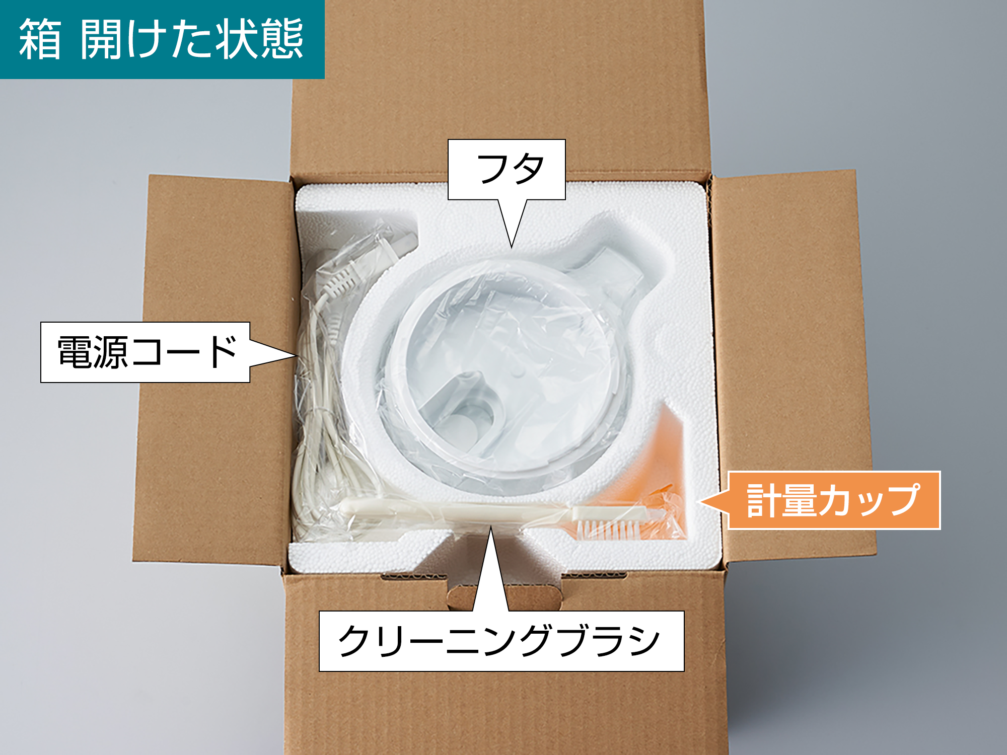箱を開けると、発泡スチロールに「ふた」「計量カップ」「電源コード」「クリーニングブラシ」があります。