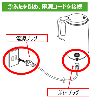 ③ふたを閉め、電源コードを本体とコンセントに接続します。