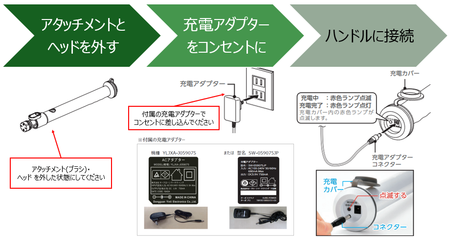 ■何も点かない場合:充電アダプターまたはハンドルいずれかの不具合が考えられます。
