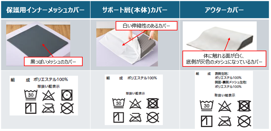 カバー類(保護用インナーメッシュカバー、サポート層カバー、アウターカバー)も洗濯機で洗えます。