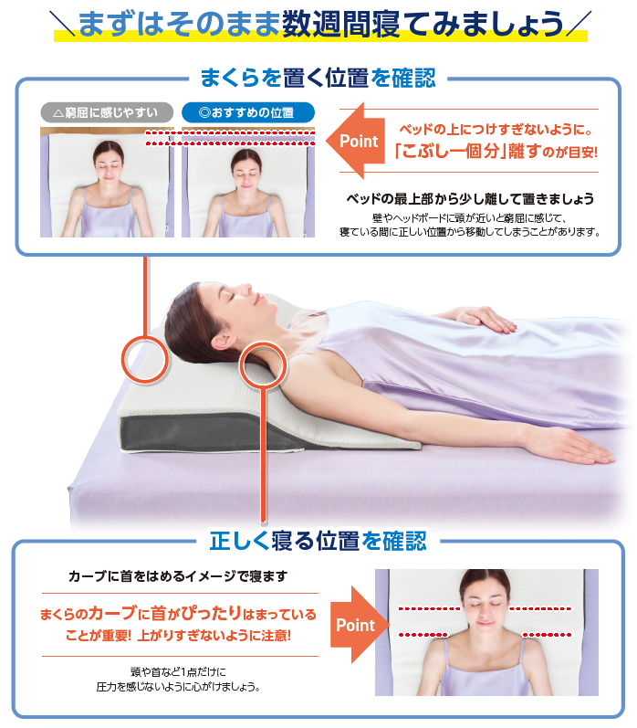一般的に新しいまくらに慣れるまでには1~2週間くらいかかるのが目安です。