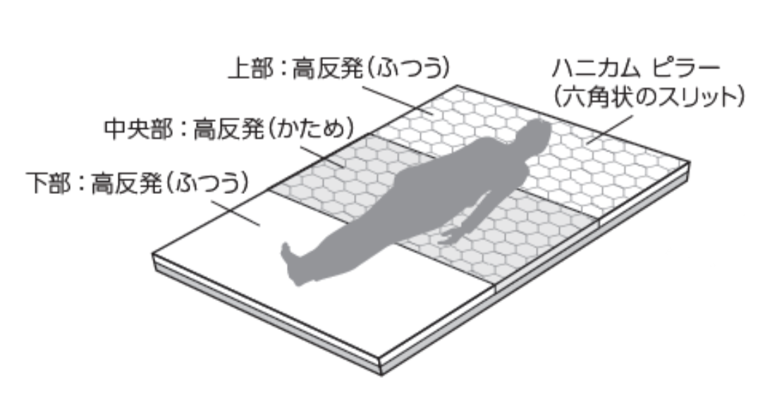 「トゥルースリーパー エアフリー」は、体の部位ごとに硬さを変えるため、上部・中央部・下部のウレタンフォームをそれぞれ独立構造で組み合わせています。