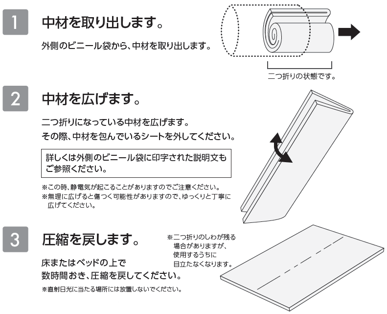 お使いいただく前にマットレスを広げた状態で半日~1日ほど陰干しして厚みを戻してください。