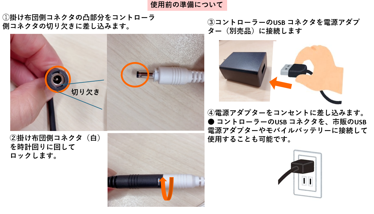 ①掛け布団側コネクタの凸部分をコントローラ側コネクタの切り欠きに差し込みます。