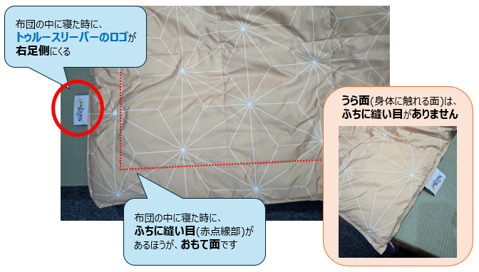 布団の ふちに、縫い目 があるほうが 上(おもて面)になります。