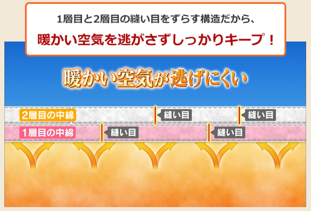 上層と下層には違う中綿が入っており、2層の縫い目をずらすことで暖かい空気が逃げにくい構造になっています。
