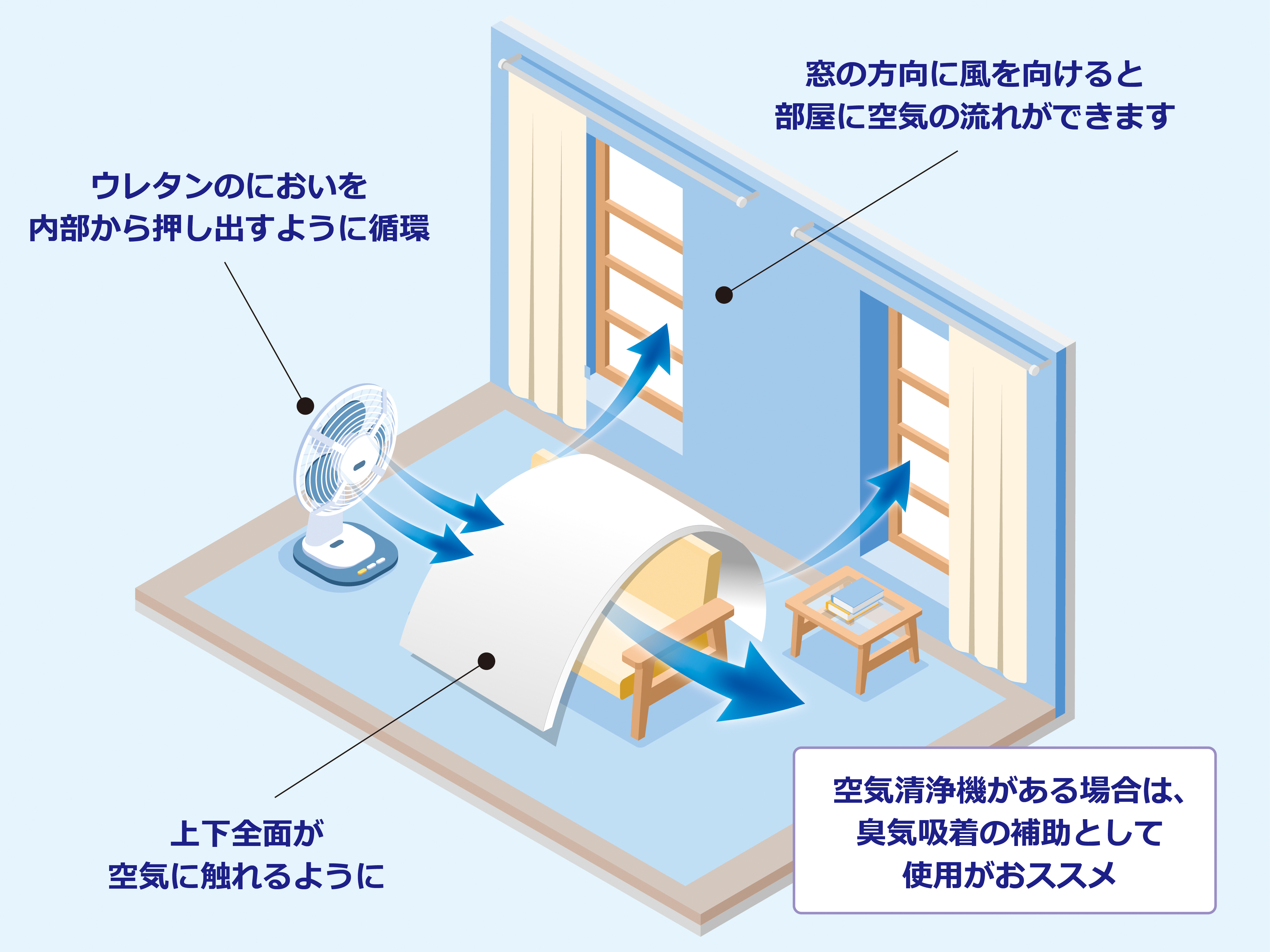 ※においが気になる場合やマットレスを干す際は、以下図のように陰干しするとオススメです。