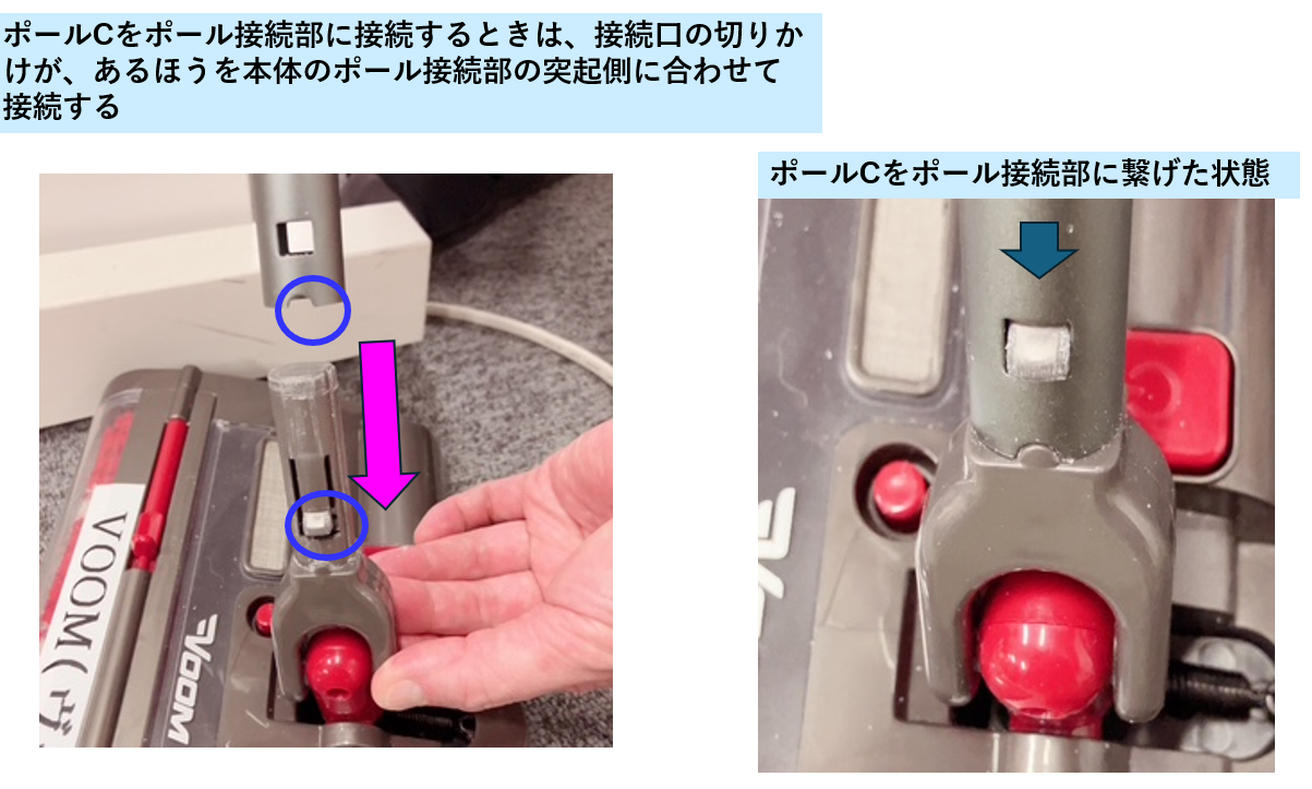 四本のポールを組み立ててください ☆組み立て方法☆ ①ポールを時計回りに回して組み立てる。ポールA ⇨ B ⇨ B ⇨ C の順につなげる ②ポールCを、本体のポール接続部につなげる ③各ポールが抜けないことを確認する 接続部分がゆるい場合は、時計回りに回してしっかり締め付けます。 ※柄の長さが長い場合はポールBを使用せず、ポールAとポールCをつなげ、短く してご使用できます。