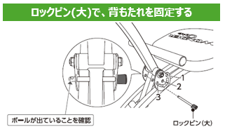 ①背もたれをいっぱいまで起こし、ロックピン(大)で「3」の穴に奥まで差し込み固定します。