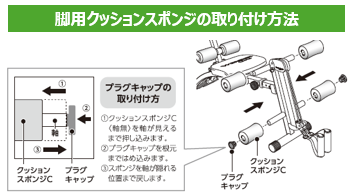 フロントフレームにクッションスポンジC(軸なし)×4個を取り付け、プラグキャップで下側のクッションスポンジを固定します。