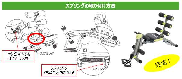 ③スプリング×2本をメインフレームの脚部と背もたれ用フレームに取り付けます。