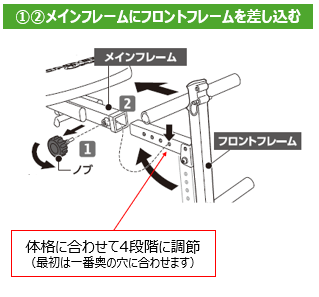③フロントフレームとメインフレームの穴を合わせて、黒いノブで固定します。