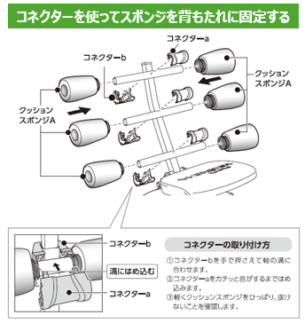 ②クッションスポンジA(6個)をフレームに差し込み、コネクターを使ってクッションスポンジを背もたれに固定します。