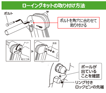 ②フロントフレームのリング付きロックピンに、ローイングキットを取り付けます。