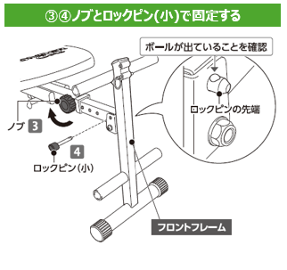 ロックピンは奥まで差し込み、ロックピン先端のボールがフレームの反対側から出ていることを確認してください。
