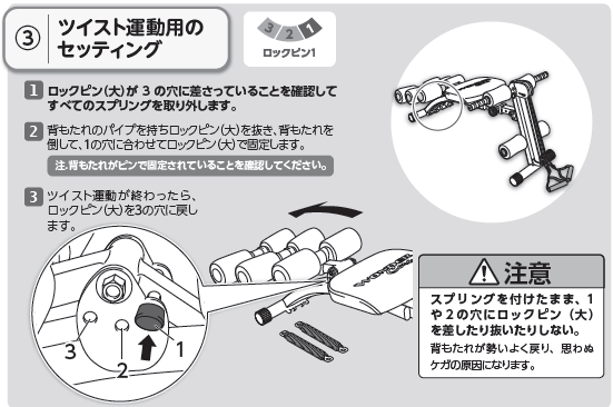 ツイスト運動が終わったら、ロックピン(大)を3の穴に戻します。