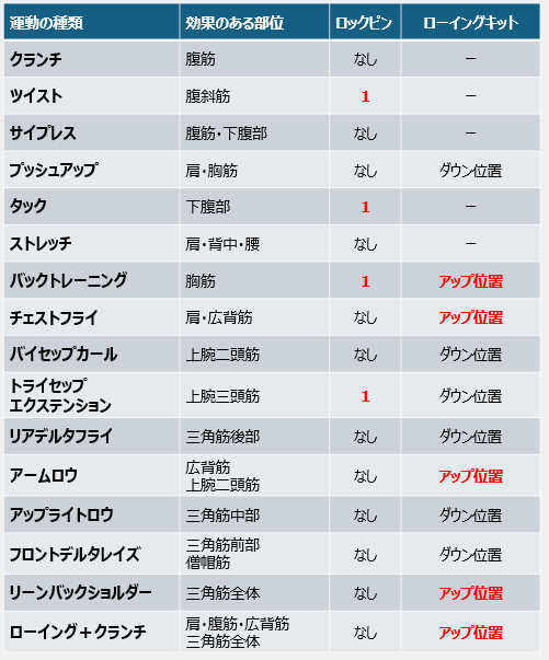 基本のエクササイズとして6種類の運動ができる他、ローイングバンドを使用した10種類のエクササイズが可能です。