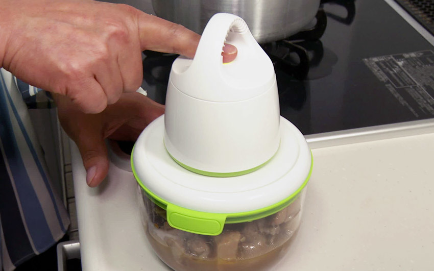 その点、フォーサなら食材入れてワンタッチで真空になる。コンテナ容器だから潰れる心配もありません。最初は本当に真空になってるのか不安もありましたが、開けるときにプシュッってなったから、本当になってるんだって。食材使って、またすぐ閉じて真空にして…っていう作業もまったく苦がなく、簡単です。