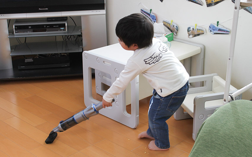 この掃除機がうちに来てから、私だけじゃなく家族みんなの行動が変わりました。まず3歳の孫が、自分の食べこぼしを自分で掃除するように。軽くて扱いやすいから、子どもでも楽しんで使えるんです。息子も、自分の掃除機を持ってるのにわざわざ1階まで降りてインビクタス ワンを取りにくるほど気に入ってます。以前は、掃除の押しつけ合いみたいな空気があったんです。でも今は誰かが自然と手に取って掃除してる。収納ステーションでアタッチメントもまとめて管理できるから、「あれどこ?」もない。見た目もおしゃれでリビングに出しっぱなしでも気にならない。インビクタス ワンが来てから、掃除が家族の会話や笑顔のきっかけになっています。
