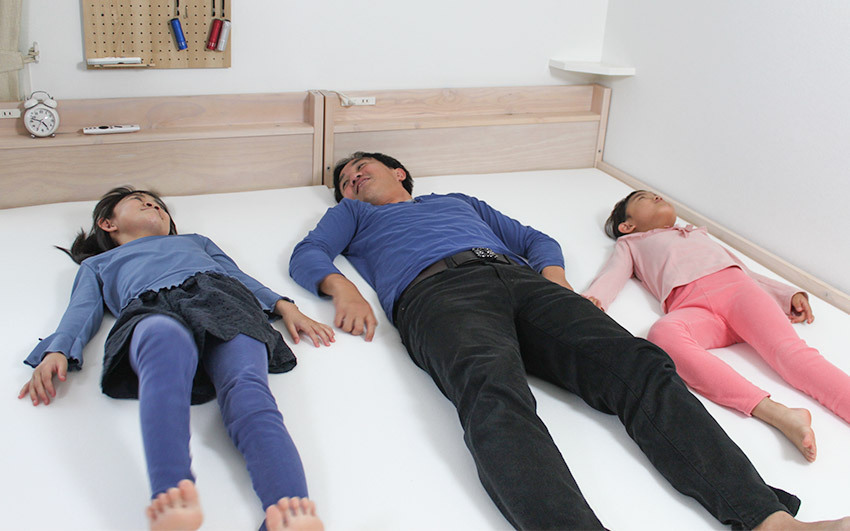 山川さんご家族はとても仲良しで、撮影はテニスコートやご自宅を含め1日かかりましたが、皆さん終始素敵な笑顔でご対応いただきました。お父様が不在時、お子様たちはおばあちゃまのお部屋の布団で就寝されますが、夜中に目を覚ましちゃうこともあるそうで、睡眠の違いを実感された嬉しいエピソードを伺いました。