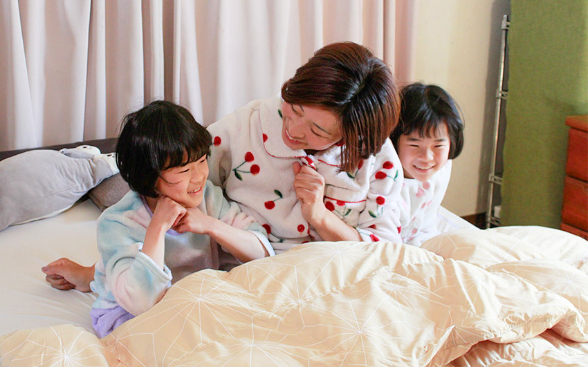 ホオンテックを使うようになって、朝の生活がガラッと変わりました。体が冷えていないから、目覚めがスムーズで気持ちがいいんです。以前は「寒いからまだ寝ていたい」と思っていましたが、今は「よし、今日も頑張ろう」と気持ちを切り替えられるようになりました。朝ご飯の準備や子どもたちの支度もスムーズで、家族みんなが朝を快適に過ごせています。子どもたちも「私もこれがいい!」と大騒ぎするほどホオンテックを気に入っています。